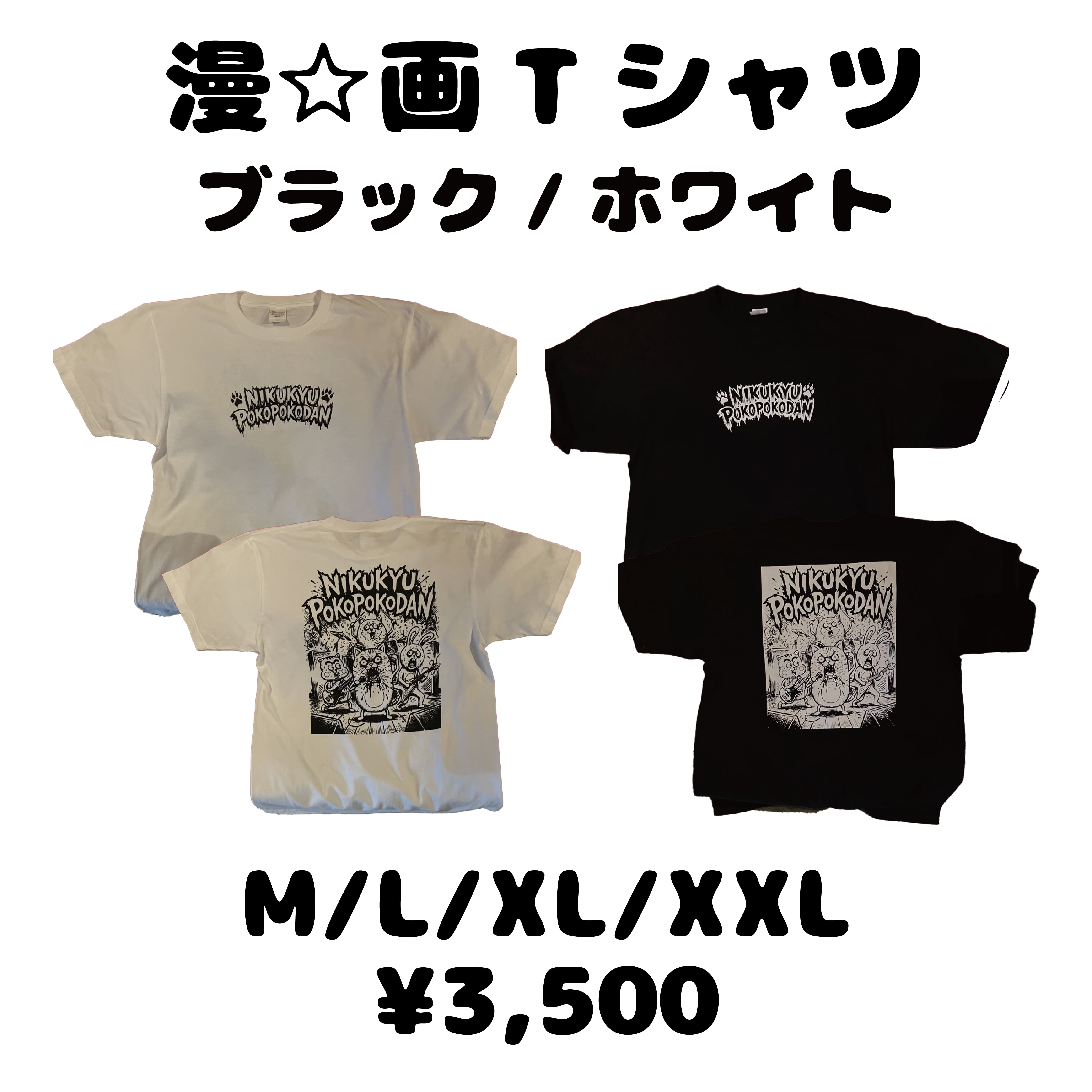 肉球ポコポコ団の漫☆画Tシャツです。 色はBLACK and WHITE、サイズはMからXXLまでです。